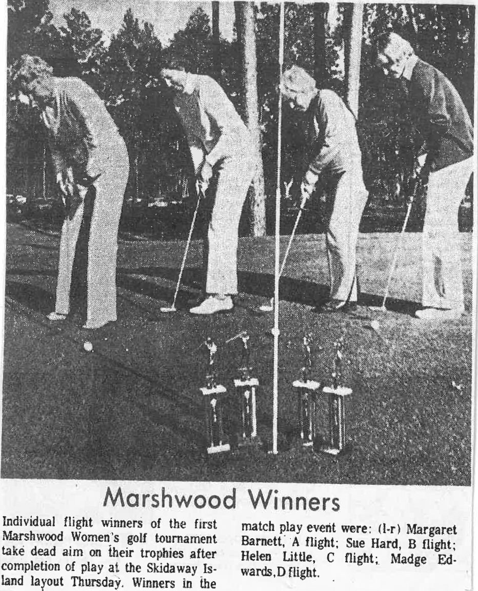 When asked about Landings Harbor, she noted that it was just called “The Marina” back then. She has seen changes as the number of dry stacks has grown and increased resident participation at summer events. When the Marshwood golf course began, it was first just nine holes, and then another nine were added. She was lucky enough to be in the group that walked around with Arnold Palmer when he came to open the back nine of Magnolia in December 1979. Her children were among the first to be in The Landings junior golf and tennis programs. There also was an early T-Ball league.