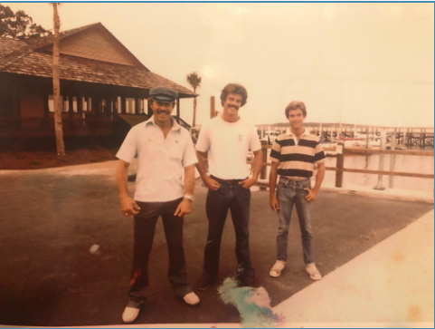 Longtime Landings Association employee Mike Bousquet (center) poses with friends at Landings Harbor Marina back in the early 80s.
