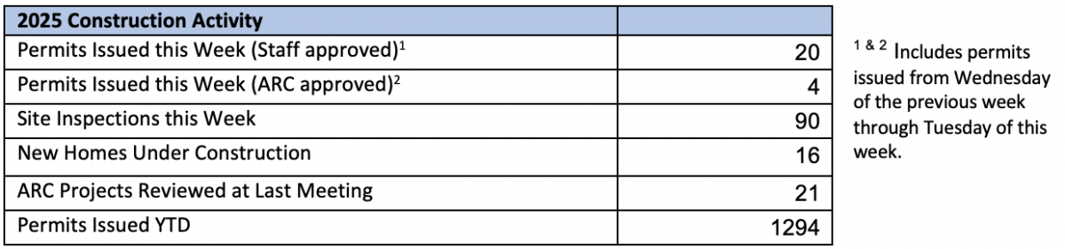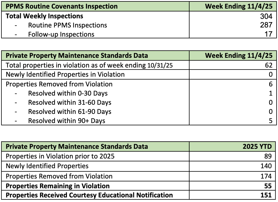 Routine inspections were conducted in Marshwood and Moon River this week. Follow-up and requested inspections were conducted throughout the island. This week, no properties were contacted regarding new violations of the Private Property Maintenance Standards, and no properties were contacted to provide courtesy education regarding property maintenance standards.
