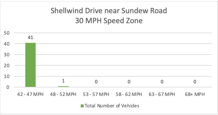 The Guardian Pro Camera has been deployed at Shellwind Drive near Sundew Road. From November 5-11, there were 42 violations. The highest record speed was 48 MPH.