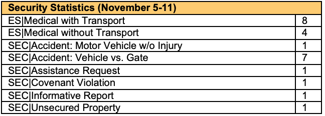Please note that a brief synopsis is provided for pertinent incidents that Security responds to during the previous week. All incidents are not covered in the weekly recap. Statistics for incident reports are provided below.